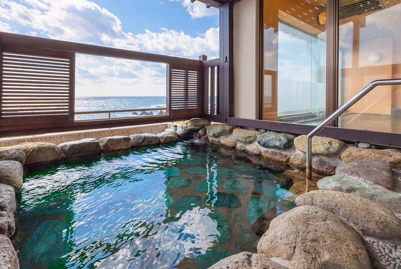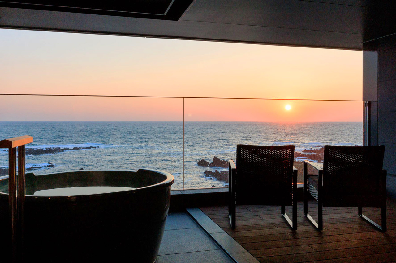 「5つの絶景風呂」が楽しめる温泉リゾートです。四季折々、佐渡の恵みと絶景を味わう口福の宿。七浦海岸に入りゆく夕陽は、広大な庭園と客室から望むことができ、絶景、感動のひとときです。大正十四(1925)年に前身の料亭「阿づ満」として出発した伝統に根ざし、豊かな山海の恵みに名うての調理陣が腕をふるう美味の数々を堪能いただけます。