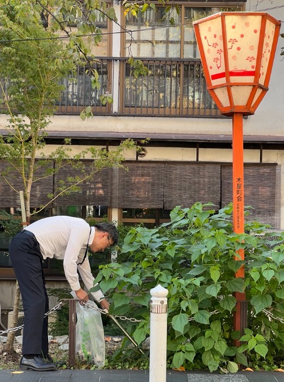 月1回実施の「木屋町会清掃活動」に参画させていただきました。この活動は、主に高瀬川周辺の清掃活動で、南は仏光寺橋から北上し四条通までの350m間の清掃です。これからも、この地域で働かせいただいているという感謝の気持ちで喜んで参加させていただきたいと思います。