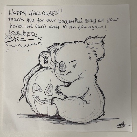 先週ご宿泊いただきましたオーストラリアからのお客様。チェックアウト前日に京都、大阪と明日から行く予定ですが来週またここに泊まりたいので予約をしたいと嬉しいコメントともに、芸術的な、かわいいコアラのイラ …